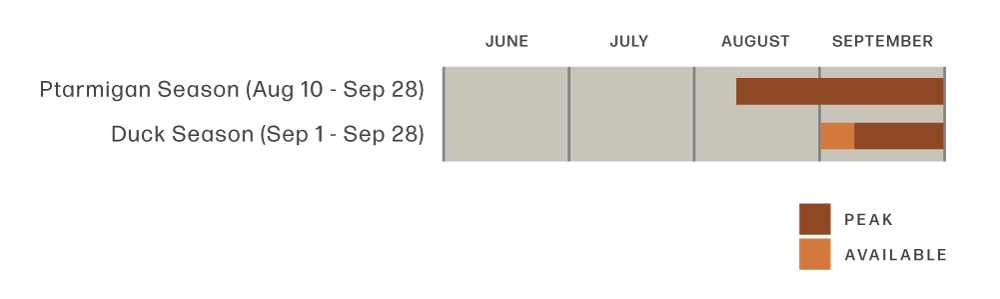 Willow Ptarmigan and waterfowl seasons coincide with some of the best stream fishing on the planet. You can combine upland bird hunting with any sport fishing package after August 10th, the perfect time to enjoy Alaska’s finest fishing for Arctic Char, Silver Salmon and Rainbow Trout.